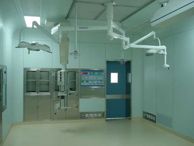 至四層護士站吊鍍鋅龍骨6厘埃特板麵煽灰油白色乳膠漆;二至四層潔淨區內,除了手術室及高危分娩室、衛生間、淋浴室外均吊50mm玻鎂彩鋼板天花吊頂,牆麵與天花連接